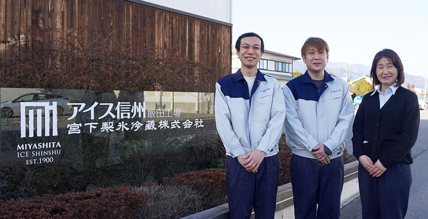 氷雪生産部製造課の吉村寛一さん(左)、食品生産部食品製造課兼購買部の福島知香良さん